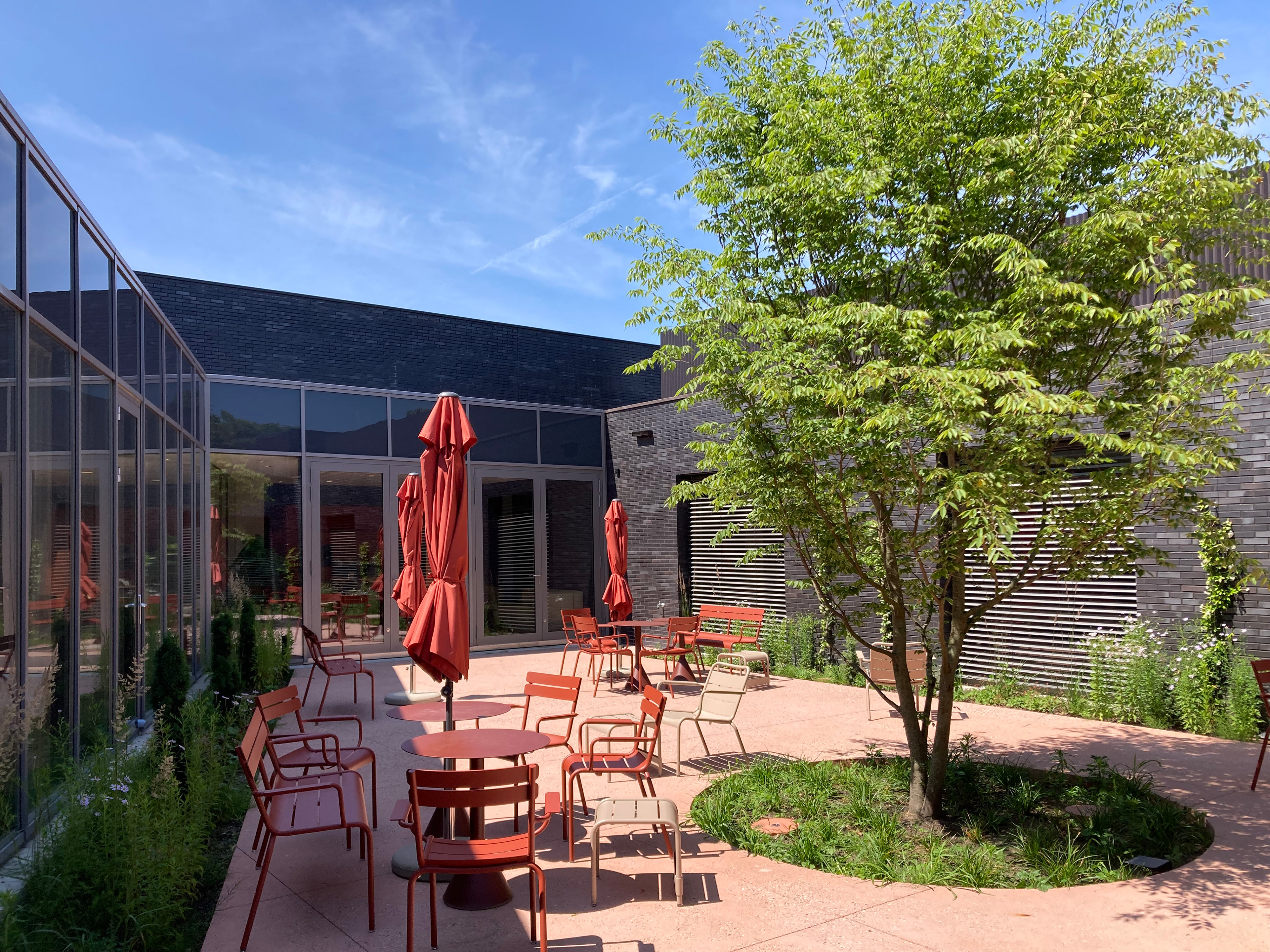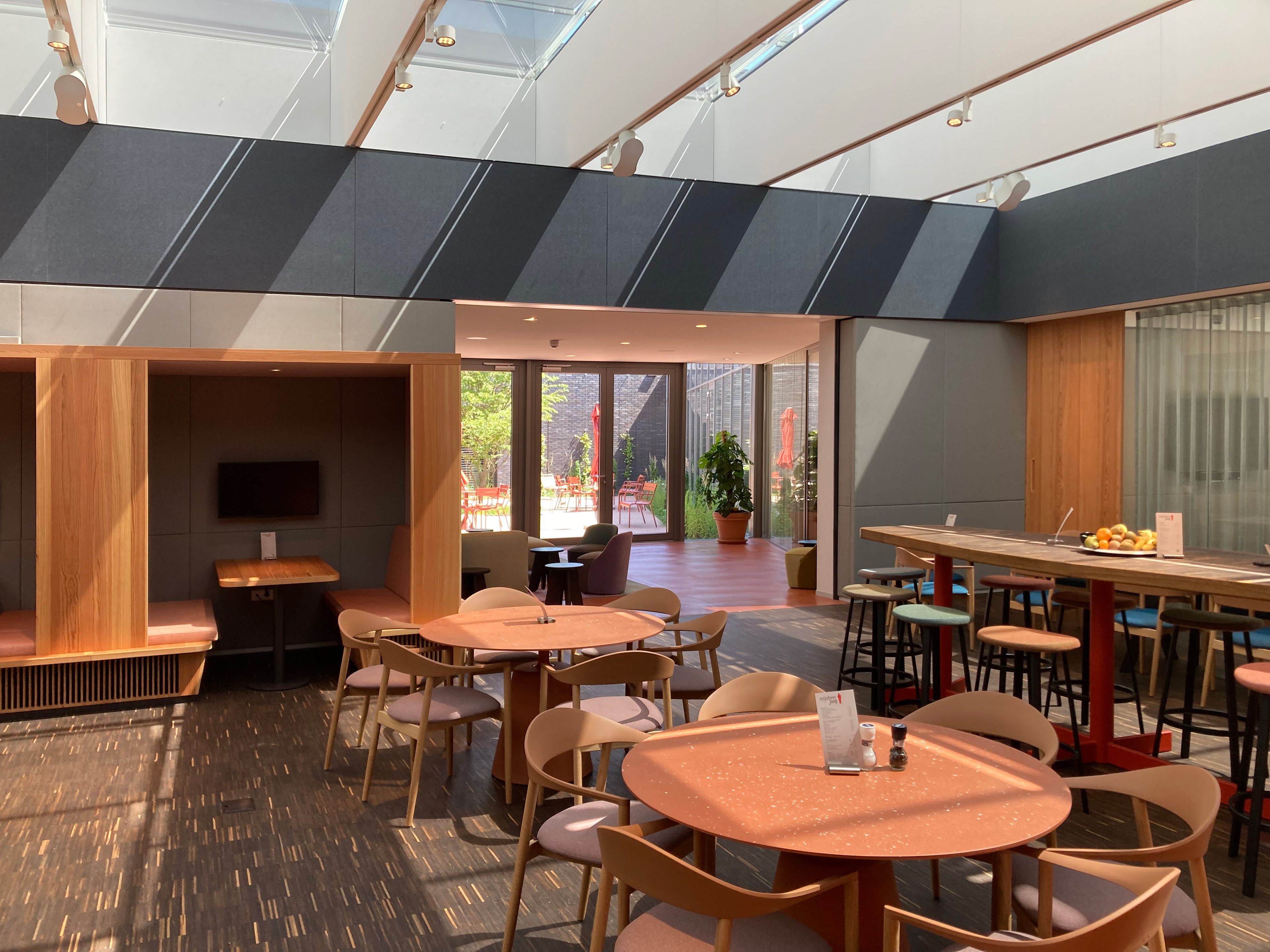 Basis voor de opgave vormt de wens een restaurant te realiseren voor het kantoor- en fabriekspersoneel. In samenwerking met MüllerVanTol is een visie ontwikkeld om een ruimte te maken waar het personeel zich even weg waant uit de werkomgeving. Door een volledig glazen dak over een rondgaande ‘fries’ door te steken ontstaat een ruimte die aanvoelt als buitenruimte. De ondersteunende vakwerkliggers zijn bekleed met doek zodat akoestische zonwerende schijven ontstaan met een spel van doorzichten en schaduwwerking tot gevolg. Een fysieke en visuele koppeling met de binnentuin gaat ervoor zorgen dat dit gebied als geheel gebruikt gaat worden voor ontspanning, overleggen en evenementen. Het maatwerk interieur is uiterst zorgvuldig uitgewerkt. Net als in de kantooromgeving worden wanden en meubels afgewerkt met eigen product.