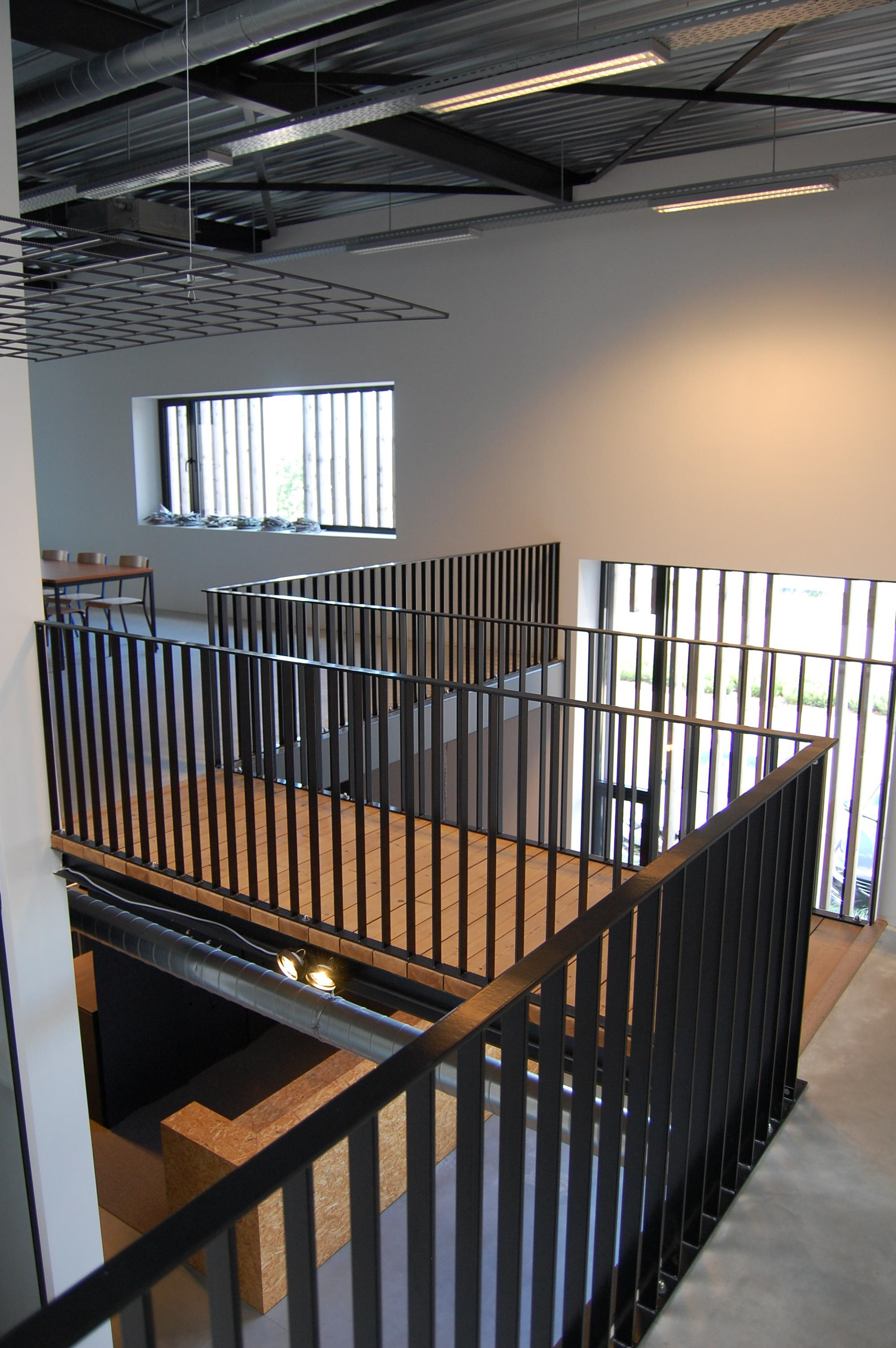 Het interieur is sober en industrieel opgevat met warme accenten. De zwart metalen structuren en houten elementen zijn van buiten naar binnen doorgetrokken. De open vide met houten loopbrug schept een openheid en luchtigheid.